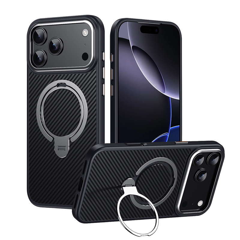 Premium carbon fiber texture with scratch resistance and anti-fingerprint finish — lightweight, stylish, and timeless.CASESUN carbon fiber textured iPhone 17 Pro Max case with dual-ring stand and silicone border.CASESUN iPhone 17 Pro Max case with dual magnetic ring stand shown in everyday scenarios for hands-free convenience.